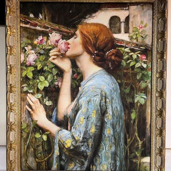 This print features The Soul of the Rose (also known as My Sweet Rose), a 1908 oil painting by renowned English Academic and Pre-Raphaelite artist John William Waterhouse. It is available on archival-grade, acid-free fine art paper or canvas. We offer a variety of size options, and shipping is free within the U.S.